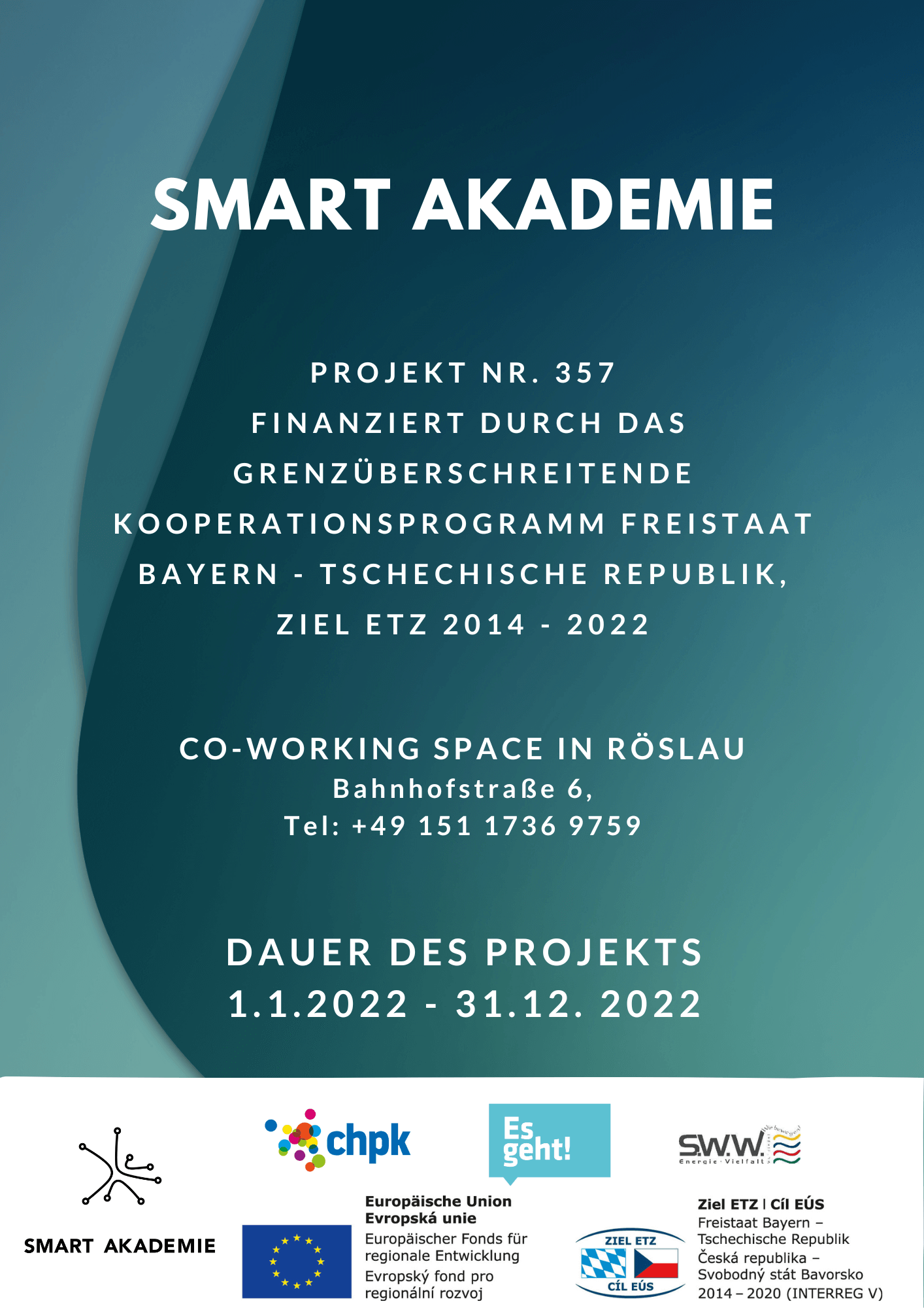 Das Projekt „Smart Akademie“ (Nr. 357) wurde im Zeitraum 01.01.2022–31.12.2022 durch das bayerisch-tschechische Interreg-Programm gefördert. Fokus: Vernetzung im Kontext smarter Technologien, Smart Cities, Smart Regions und Digitalisierung.